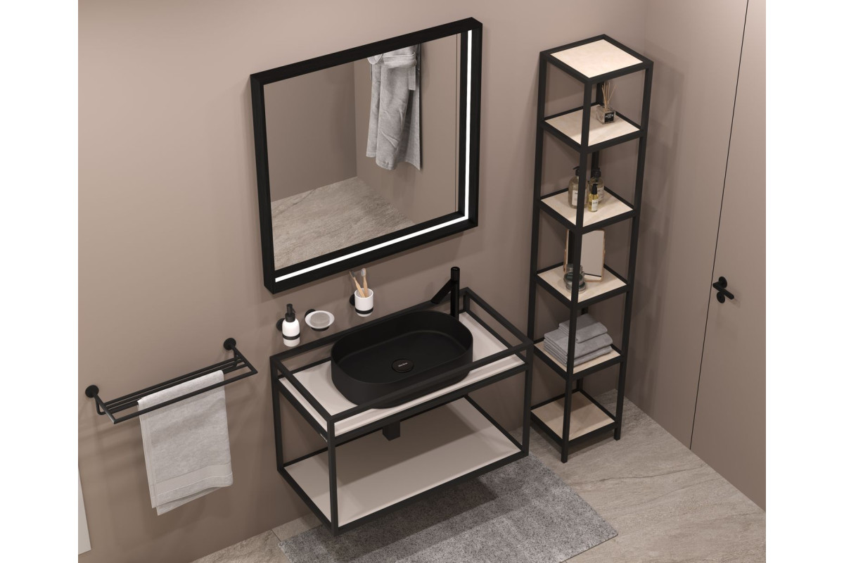 Стильные каркасы тумб и пеналов выполнены из металла, имеют брашированную поверхность с нанесением цвета путем анодирования.